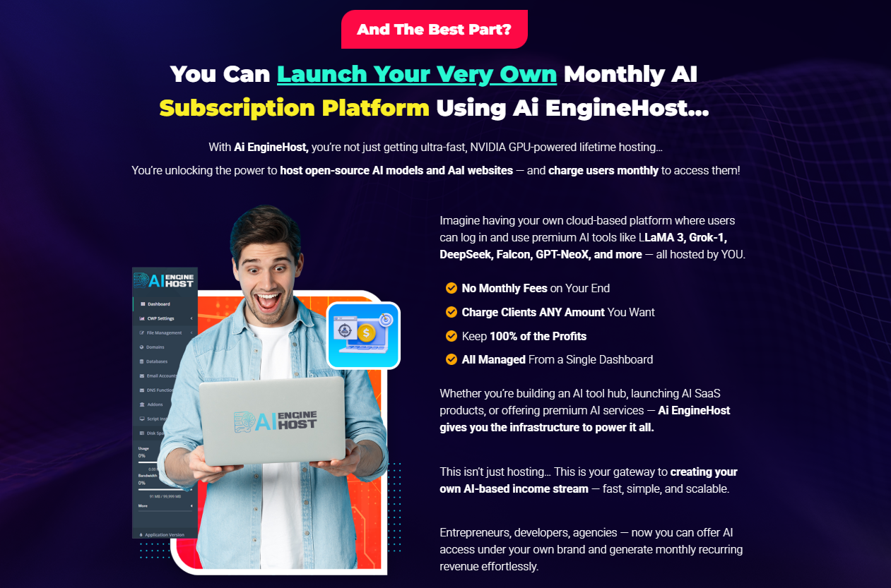 AI EngineHost is more than just a web hosting solution-it’s a powerful platform for launching and monetizing AI services. Thanks to its built-in support for open-source AI models like Grok-1, DeepSeek, and LLaMA 3, developers and entrepreneurs can build scalable AI applications and turn them into profitable digital products. From chatbots to content generators, the possibilities are endless.